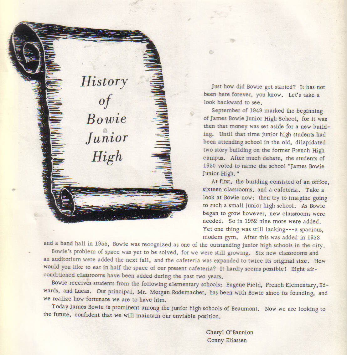 Beaumont, Texas ![]() We all remember our Jr. high days. I know my days at Bowie were wonderful and I will cherish them always, just as I do my days at FHS. I hope these few pages and pictures bring back a lot of good memories for you too. *************************************************** ![]() The above was taken out of one of the year books. So we know how and when Bowie Opened. WHEN did it close? What was it in '86/'87 when French closed? I heard FHS was empty for a while. I know Bowie became French Elem. and Bowie moved in to the French building on Concord. And became Willie Ray Smith Middle School. But not sure what year that was.. ![]() I remember Mr. Rodemacher with fond memories. Mr. Rodemacher passed away Aug. 9, 1989 Back to Courier Page Page 2 ( Bowie yearbooks) BACK to FHS |