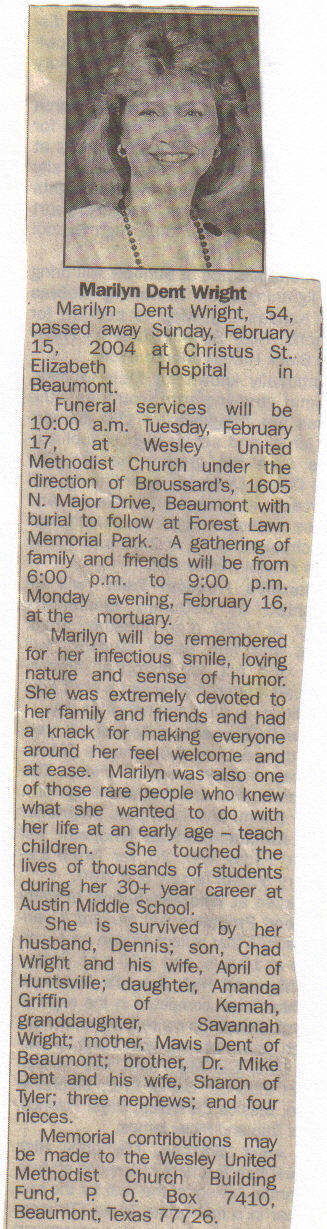She is survived by her husband, Dwight Rash of Lumberton; daughter, Stephanie Rawlinson and her husband, Todd, of Fannett; brother, Dale Bond and his wife, Peggy, of Tomball; mother-in-law, Joyce Rash, of Lumberton; and many loving family members. Mary was preceded in death by her mother, Dessie Bond; father, Russell Bond; and son, Chad Rash. Most of all, Mary will be remembered for her boisterous laugh and big hugs.